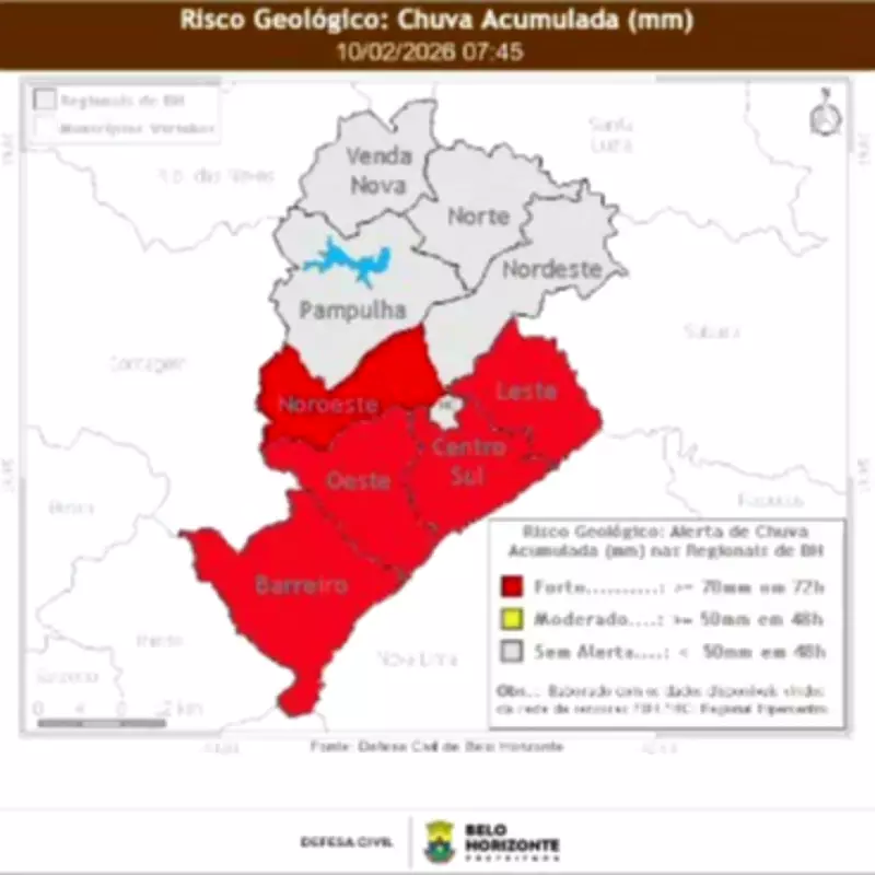 A Defesa Civil de Belo Horizonte emitiu, nesta terça-feira (10), um novo alerta de risco geológico forte para cinco das dez regionais da capital mineira. O aviso abrange as áreas Noroeste, Leste, Centro-Sul, Oeste e Barreiro, onde os moradores devem redobrar a atenção devido às condições climáticas adversas.