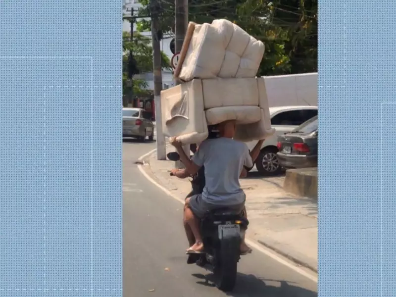 O vídeo, que rapidamente se espalhou pelas redes sociais, mostra a cena surpreendente. Enquanto o motociclista conduz a moto, o passageiro — que deveria estar apenas segurando no ombro do piloto — mantém uma poltrona de espuma apoiada sobre a cabeça, sem qualquer tipo de amarração. Uma verdadeira acrobacia no trânsito carioca.