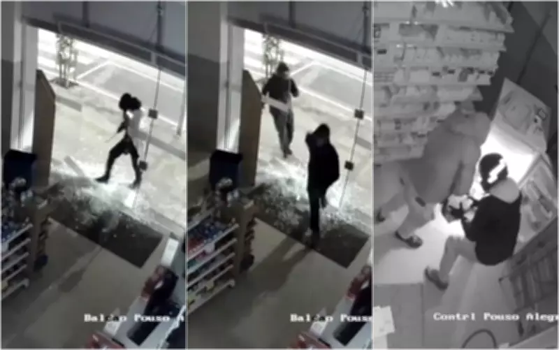 As câmeras de segurança da farmácia capturaram toda a ação, que ocorreu por volta das 3h45. As imagens mostram um dos suspeitos, vestindo roupas escuras e com o rosto coberto, quebrando a porta de vidro da entrada principal para acessar o local. Em seguida, outros dois homens, sendo que um deles usava capacete, correm e entram pela abertura.