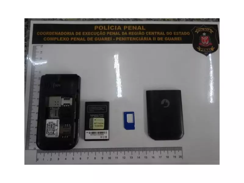 Dentro da sacola, os policiais localizaram um telefone celular completo, acompanhado de uma bateria extra e um adaptador para chip de operadora. O material estava oculto entre os outros itens.