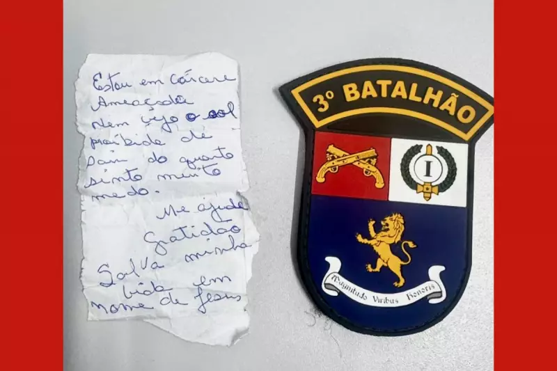 Durante o atendimento policial, um dos militares percebeu que a vítima tentava, discretamente, colocar um papel no bolso da camisa de uma testemunha. O documento era um bilhete de socorro escrito pela própria mulher, que revelava a gravidade da situação.