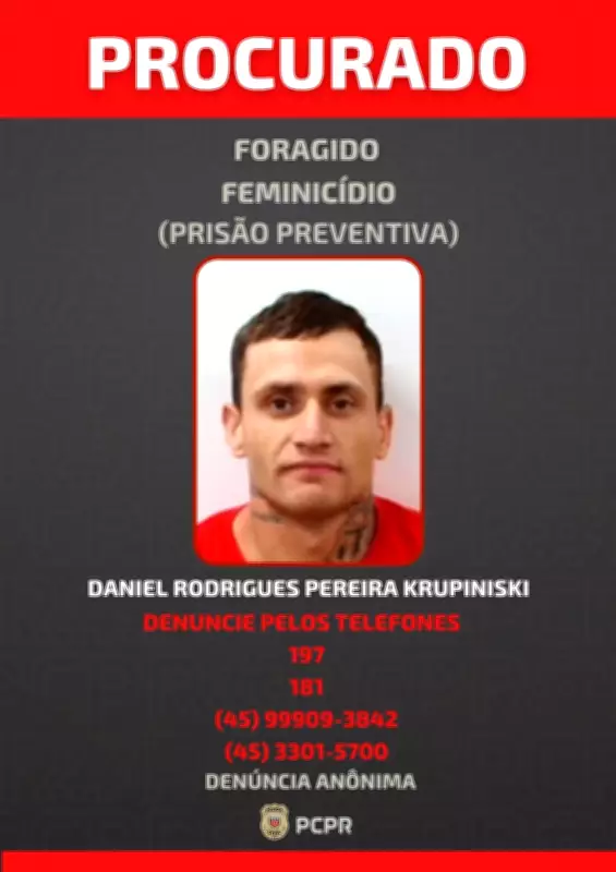 A Polícia Civil do Paraná divulgou a imagem de Daniel Rodrigues Pereira Krupiniski, de 24 anos, suspeito de assassinar a própria esposa, Mayara Araújo Krupinski Rodrigues, de 31 anos, na cidade de Cascavel. O crime ocorreu na quarta-feira (18), quando o homem desferiu múltiplas facadas na vítima dentro de sua residência.