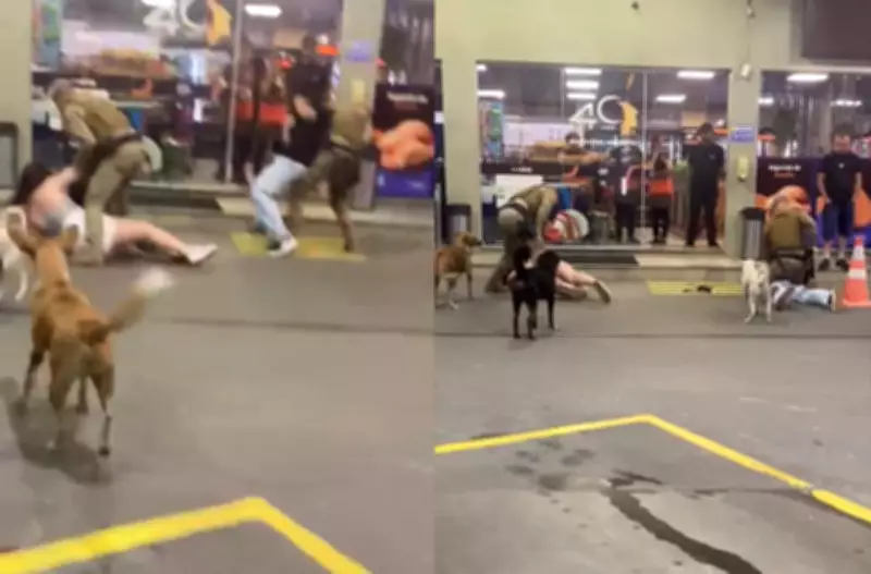 Após alguns momentos, uma funcionária do posto se aproxima e cobre parte do corpo da mulher, que continuava imobilizada no chão sob o peso do agente. Logo depois, ela é solta e senta no chão, enquanto o homem segue deitado e imobilizado pelos policiais.