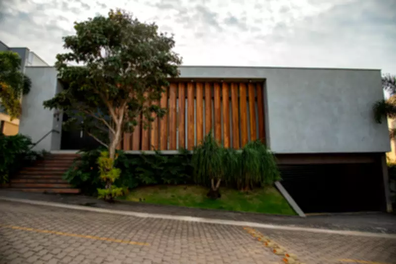Do lado de fora, a residência assume um caráter mais contido e reservado. A fachada principal se destaca pela composição sóbria e marcante, em que o contraste entre o grande plano cimentício e os brises verticais em madeira criam ritmo, textura e personalidade. A presença do paisagismo reforça a sensação de acolhimento e aproxima a arquitetura da natureza, sem abrir mão da imponência. Essa escolha estética também cumpre um papel importante na vivência dos moradores: proteger a intimidade. A casa se fecha para a rua com discrição, mas sem perder força visual. É uma arquitetura que se preserva, ao mesmo tempo em que revela cuidado com cada detalhe.