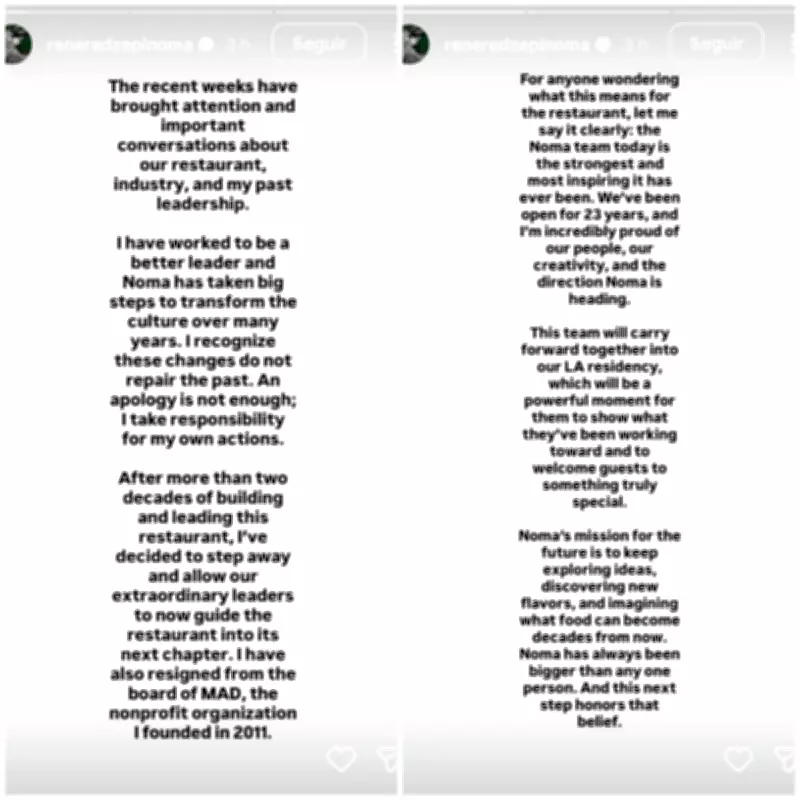 Em seu perfil no Instagram, René Redzepi publicou uma nota extensa assumindo responsabilidade pelas ações relatadas. "Tenho trabalhado para ser um líder melhor e o Noma deu grandes passos para transformar sua cultura ao longo de muitos anos. Reconheço que essas mudanças não reparam o passado. Um pedido de desculpas não é suficiente; assumo a responsabilidade por minhas próprias ações", escreveu o chef.