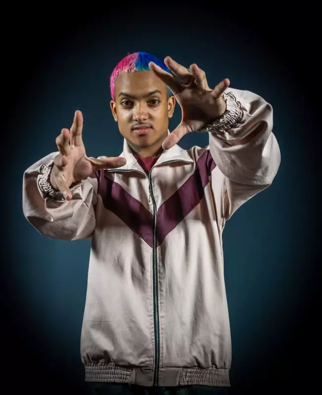 Entre suas marcas registradas está o cabelo pintado ao meio de azul e rosa. O artista também se declara fã de MC Kevin, funkeiro que morreu ao cair de um apartamento em 2021 no Rio de Janeiro.