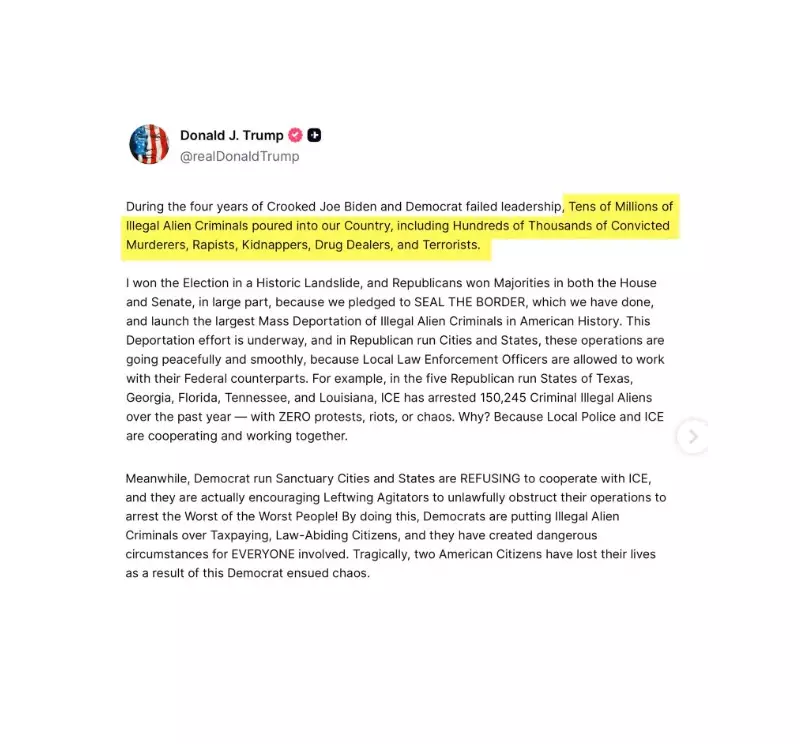 Em sua publicação, o presidente norte-americano destacou que, sob o governo do ex-presidente Joe Biden, dezenas de milhares de imigrantes ilegais entraram no país, incluindo indivíduos condenados por crimes graves como assassinato e terrorismo. Trump contrastou essa situação com operações de deportação que, segundo ele, ocorrem de forma pacífica em estados republicanos como Flórida e Georgia, onde a polícia local colabora com o ICE.
