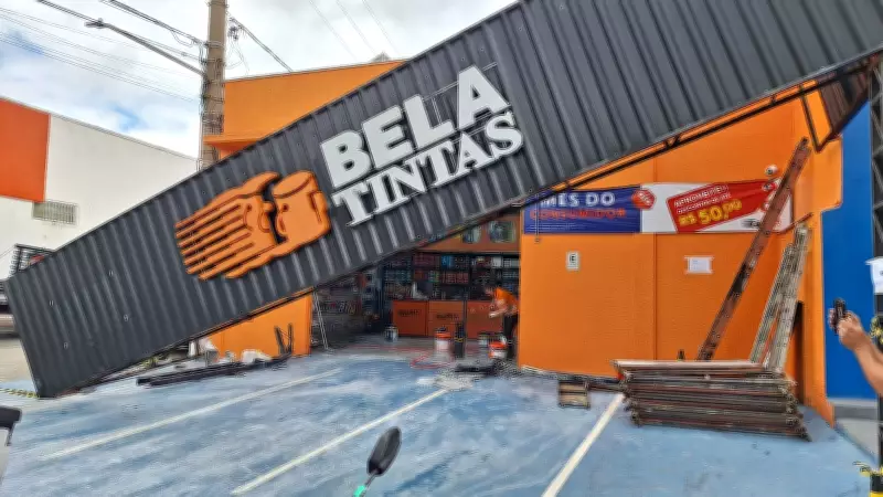 Após o primeiro impacto, o automóvel voltou para a via principal e colidiu violentamente contra uma viga estrutural da loja de tintas. A força da colisão foi suficiente para derrubar completamente a fachada metálica do estabelecimento comercial.