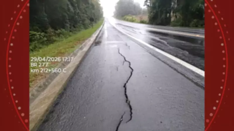 A BR-277, uma das principais rodovias do Paraná, teve uma pista interditada parcialmente nesta quarta-feira (29) no trecho entre Palmeira e Irati, nos Campos Gerais. O motivo foi uma rachadura que surgiu no asfalto em meio à chuva intensa. Até o momento da publicação, a interdição parcial permanecia no sentido Palmeira.
