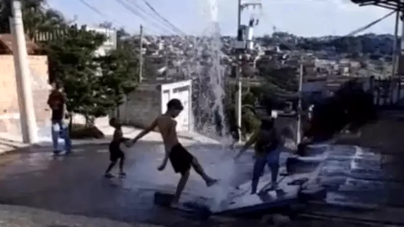 Um cano da Companhia de Saneamento Básico do Estado de São Paulo (Sabesp) estourou na tarde de sexta-feira (30), transformando-se em um inesperado chafariz no bairro Jardim Napoli 2, em Itaquaquecetuba. O incidente ocorreu na rua Central, onde a água jorrou intensamente, formando uma atração peculiar para as crianças da região.