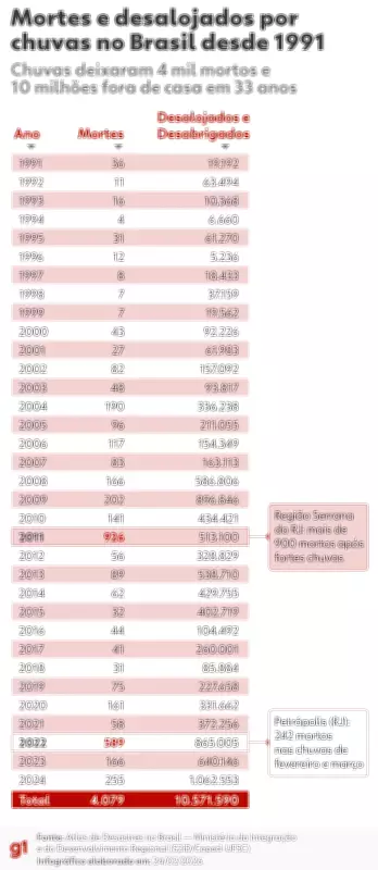 Segundo o Atlas de Desastres do Ministério da Integração e do Desenvolvimento Regional, entre 1991 e 2024, os desastres associados a chuvas no Brasil resultaram em ao menos 4.079 mortos e aproximadamente 10,5 milhões de pessoas desalojadas ou desabrigadas. O ano de 2011 foi o mais letal, com 926 óbitos, principalmente devido à tragédia na Região Serrana do Rio de Janeiro, que vitimou mais de 900 pessoas.
