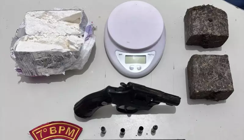 Com o suspeito, os policiais encontraram e apreenderam uma bolsa preta que continha uma quantidade significativa de drogas e uma arma de fogo. O material apreendido inclui: