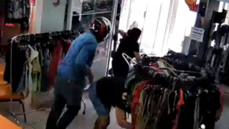 Pelos registros das câmeras de segurança, é possível observar o suspeito entrando no estabelecimento de capacete e, em seguida, golpeando as duas vítimas. Uma delas é a proprietária da loja, e a outra é uma funcionária. O agressor também arrancou uma corrente de ouro do pescoço da proprietária, conforme consta no boletim de ocorrência.